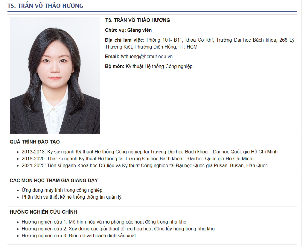 Tran Vo Thao Huong, a PhD graduate of Professor Soondo Hong’s research laboratory, received her PhD degree in 2025 and has since joined the Department of Industrial Systems Engineering at Ho Chi Minh City University of Technology as an Assistant Professor.